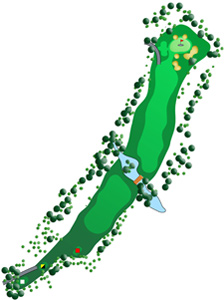 Das längste Par 4 auf dem Platz ein guter Abschlag entscheidet maßgeblich über den Score. Der Spieler der auf Nummer sicher gehen möchte legt den Ball vor den Bachlauf und kann auf diese Weise ein Bogey notieren. Um besser als ein Bogey zu spielen, muss der Spieler den Teeshot mindestens 200 Meter carry über den Bachlauf spielen. Mit einem mittleren Eisen ist das Grün dann "in regulation" zu erreichen und das Par in greifbarer Nähe.